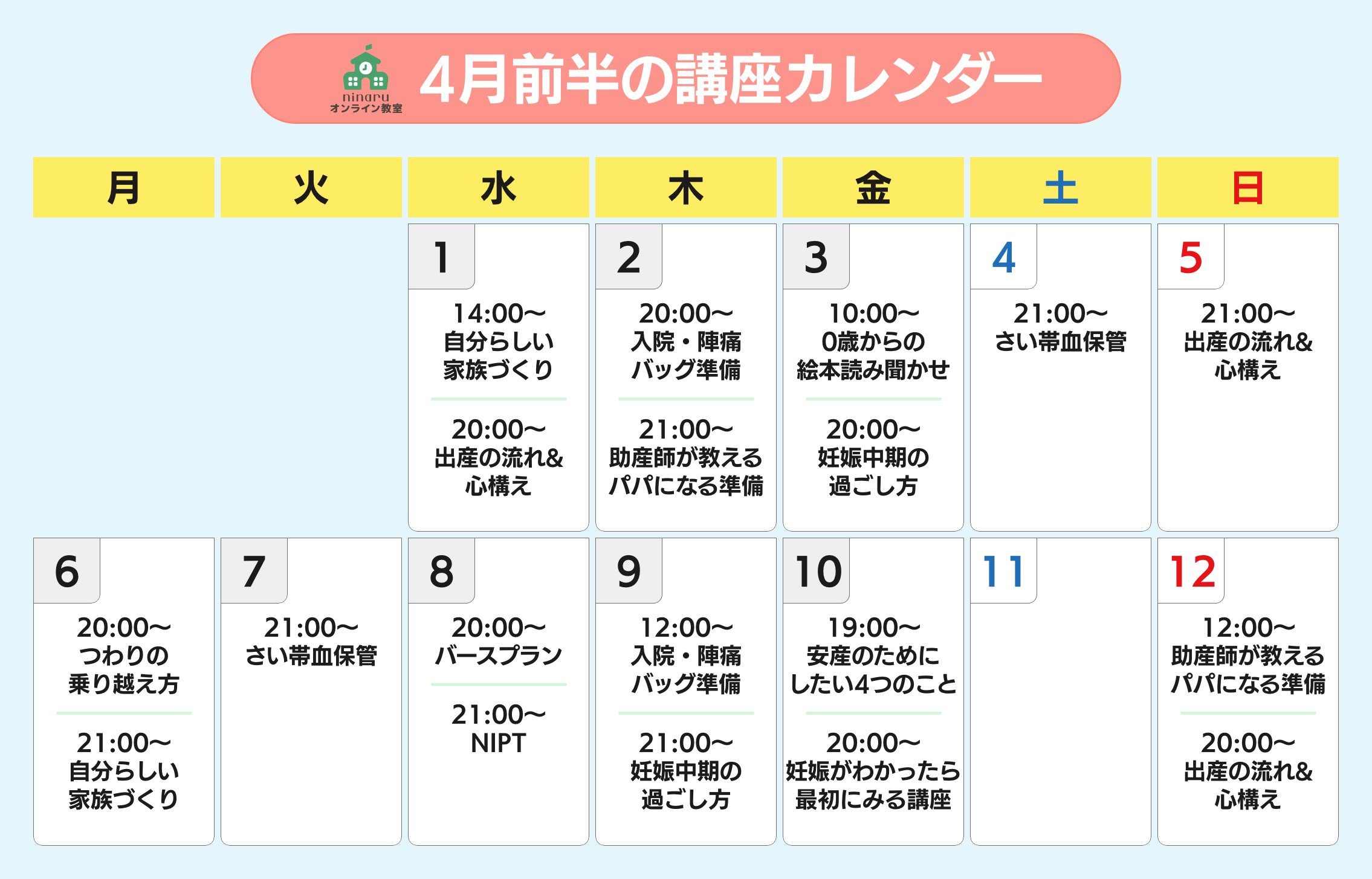 ninaruでは、妊娠中から育児に役立つさまざまなオンライン講座を無料で開催しています。以下からもぜひチェックしてみてくださいね♪