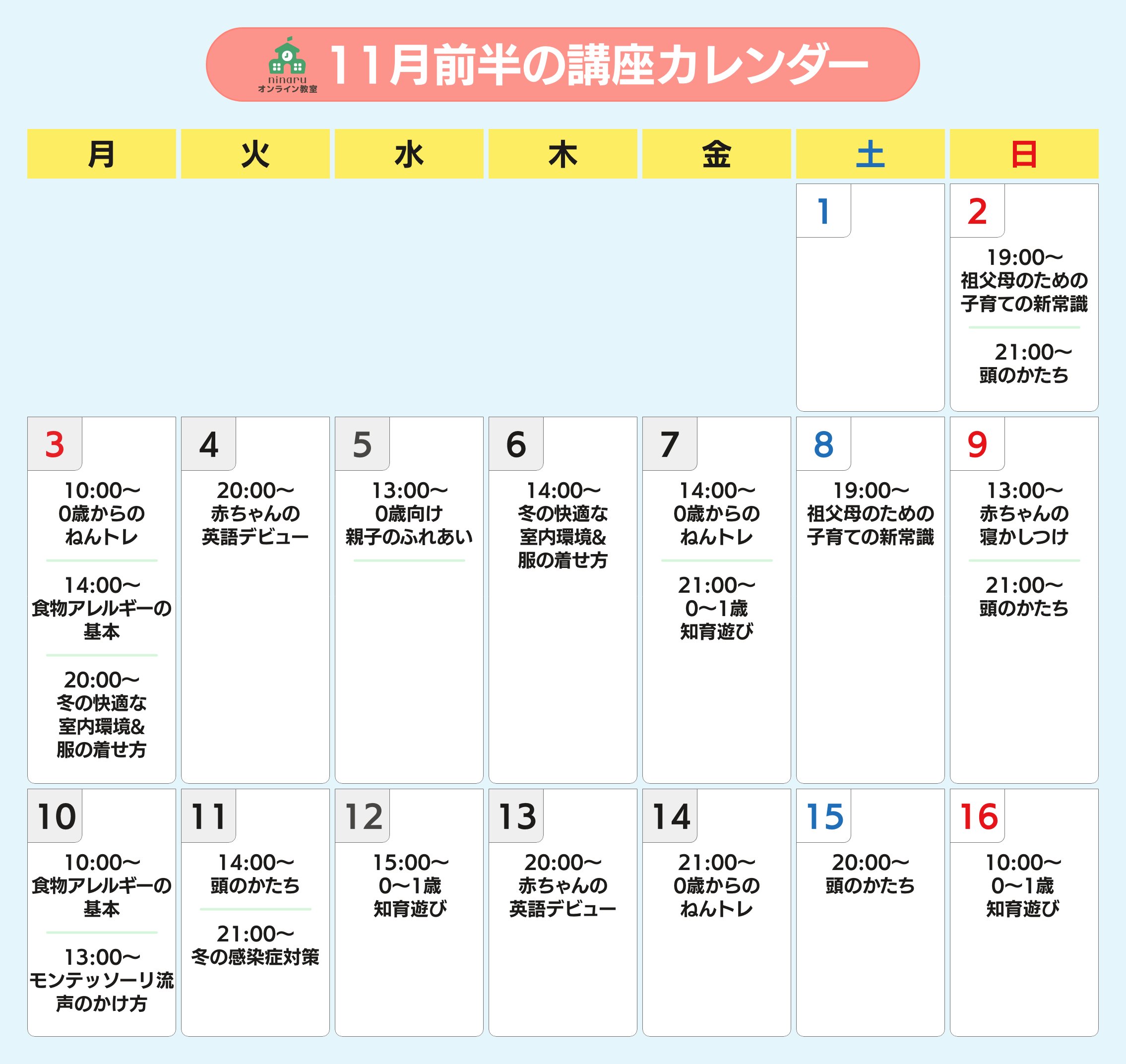 ninaruオンライン教室 2025年11月前半カレンダー(baby)